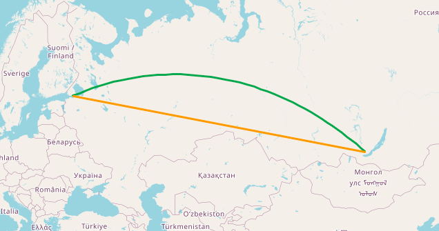 Визуальное отличие выбранной опции точно будет заметно при нанесении объектов у которых начальные и конечные точки находятся на значительном расстоянии друг от друга (больше 100 км). Например, на рисунке ниже изображены две линии проведенные от Санкт-Петербурга до Иркутска. Зеленая линия нанесена по сфероиду, а оранжевая по проекции, что при таких больших расстояниях отлично видно, соответственно у данных объектов будет разная длина.