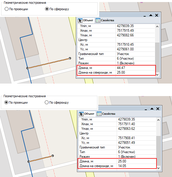 На первом рисунке варианте геометрические построения производились по сфероиду. В этом случае длина участка получилась реальная, это видно в окне () строка Длина на сфероиде, м.