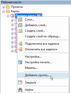 Рисунок 54. Добавление группы в карту через панель Рабочее место
