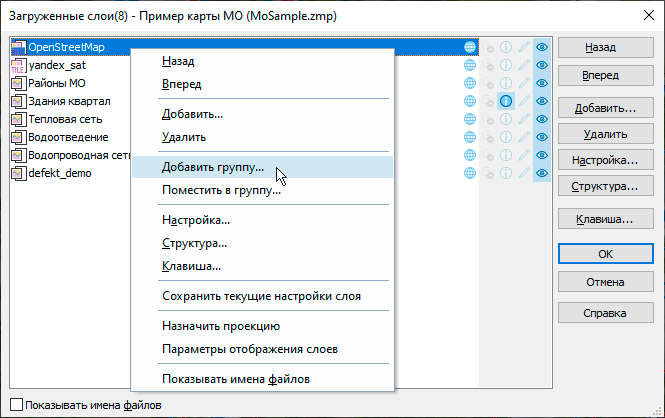 Сделайте щелчок правой кнопкой мыши в области списка слоев карты или по названию уже существующей группы. Второй вариант используется, если требуется создать подгруппу. В контекстном меню выберите пункт .