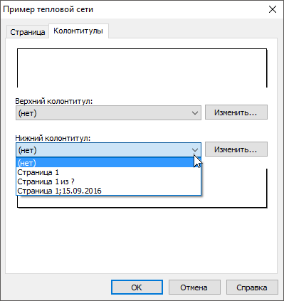 В данной вкладке имеется возможность настроить колонтитулы для печати карты. Отдельно настраиваются нижний и верхний колонтитул. По умолчанию есть уже готовые три варианта настройки: