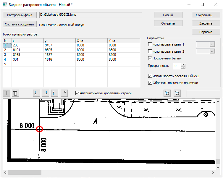 Данные о точках привязки отображаются в таблице Точки привязки растра:. В поле N приводится номер точки, в полях x, y – координаты точки растра (в пикселях), X и Y – координаты этой же точки на карте в выбранной системе координат. Флажок Автоматически добавлять строки под таблицей управляет добавлением в таблицу точек привязки. Если флажок установлен, то информация о добавляемой точке размещается в новой строке внизу таблицы, если флажок сброшен – замещается информация в текущей строке таблицы. Для добавления координат точки привязки на растре доступно несколько способов: