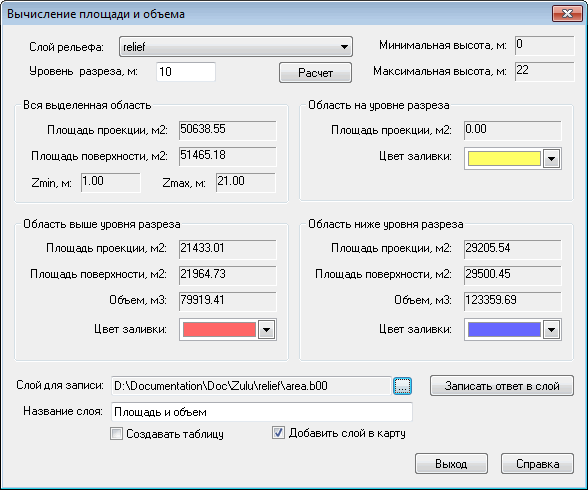 Вычисление площадей и объемов замкнутых областей на карте с учетом рельефа возможно только в случае использования TIN-рельефа. Вы можете указать область самостоятельно или воспользоваться отдельным слоем с уже заданными областями.