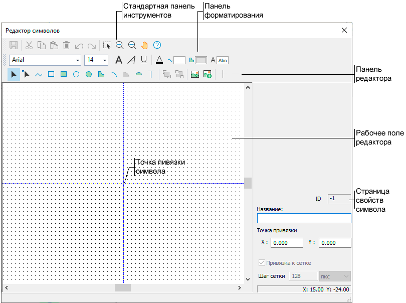 Редактор символов – это простейший графический редактор, предназначенный для создания и редактирования графических символов. Изображение может состоять из комбинации векторных элементов и растровых изображений (Bitmap). При использовании сплошной заливки у векторных элементов возможно задавать степень прозрачности символа.