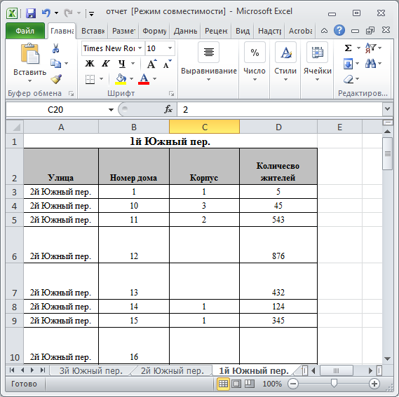 В результате проделанных действий мы получим файл книги Excel с тремя листами: 1й Южный пер., 2й Южный пер., 3й Южный пер.: