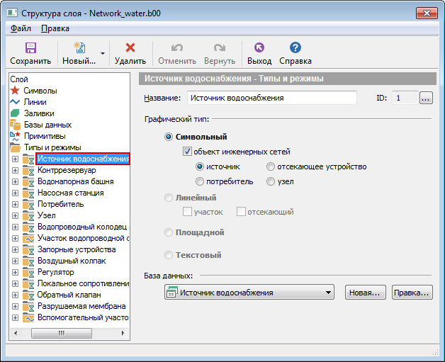 Дерево типов и режимов находится в структуре слоя водопроводной сети. При выделении левой кнопкой мыши типа объекта (например, источник), в дереве типов и режимов справа откроется вкладка, в которой отобразятся свойства выделенного типа: