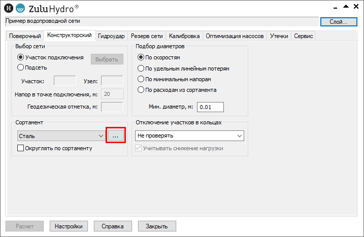 На панели ZuluHydro рядом с названием сортамента нажать кнопку