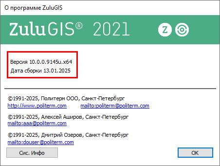Для определения номера установленной версии ZuluGIS выберите в меню пункт , в появившемся окне обратите внимание на цифры, выделенные на рисунке снизу. Данные цифры являются номером версии и датой сборки.