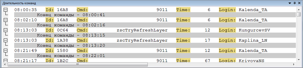 Формат вывода команд: время начала команды, ID соединения, расшифрованная команда, общее время выполнения команды в секундах, логин пользователя. Для удобства названия столбцов раскрашены светло-золотым цветом. Каждая нечётная строка представляет собой информацию о команде, а каждая чётная строка представляет собой информацию об астрономическом времени завершения команды (чётные строки выделены серым цветом).