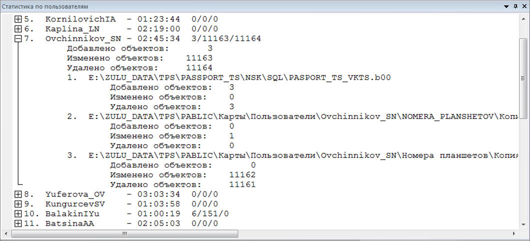 В окне Статистика по пользователям отображается информация о деятельности пользователей на сервере: сколько времени они работали, сколько объектов и на каких слоях добавляли, редактировали или изменяли.