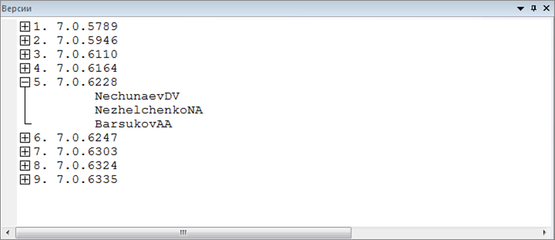 Информация представлена в виде двух уровней. На первом уровне выводятся номера версий, а на втором их пользователи.
