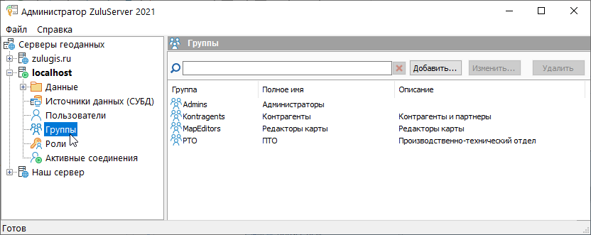 Для управления группами пользователей выберите в окне Администратора ZuluServer элемент Группы. Список групп представлен в виде таблицы, которая содержит столбцы с названием, полным именем и кратким описанием. Щелчок по заголовку столбца сортирует данные по убыванию (по возрастанию). В правой верхней части окна расположен фильтр для быстрого поиска из списка и кнопки управления пользователями.