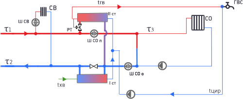 Потребитель с двухступенчатым смешанным подключением подогревателей ГВС