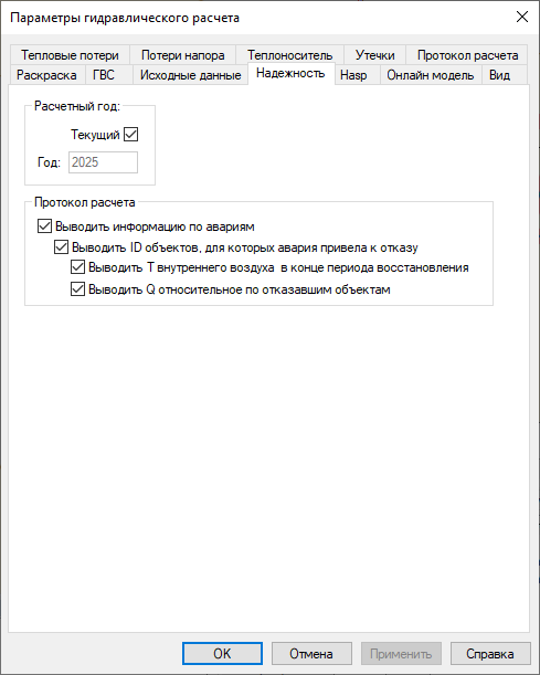 На вкладке надежность задаются настройка расчета надежности и ведение протокола надежности.