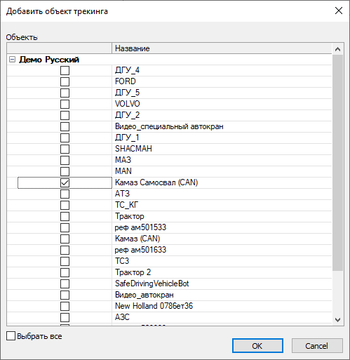 На экране отобразится список доступных объектов с сервиса трекинга.