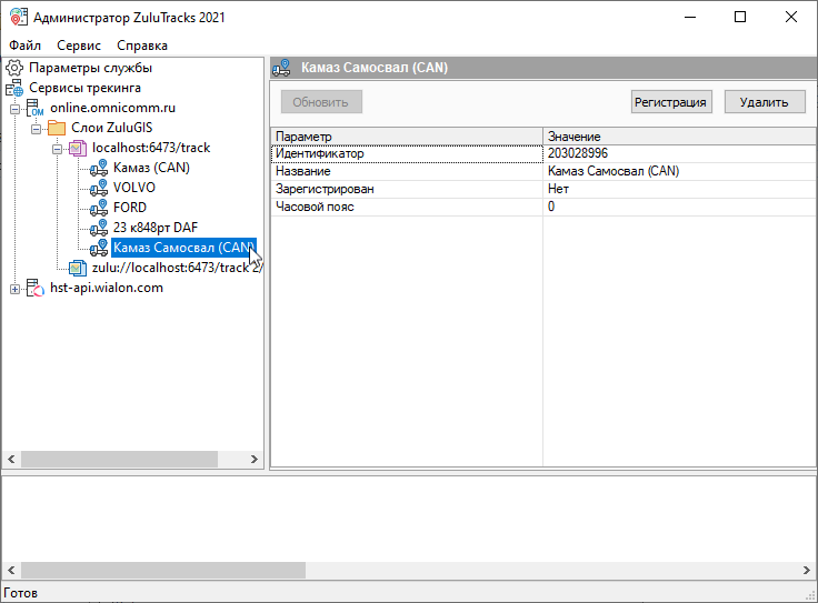 Объект трекинга должен быть зарегистрирован в слое ZuluGIS (статус отображается в поле Зарегистрирован). Для регистрации объекта нажмите кнопку , статус объекта должен измениться.