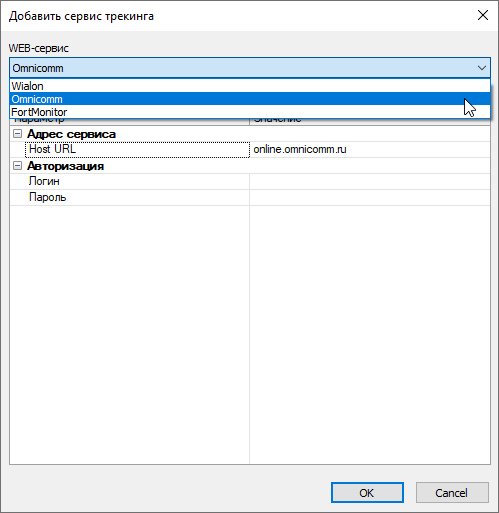 В открывшемся окне выберите из выпадающего списка сервис трекинга Omnicomm:
