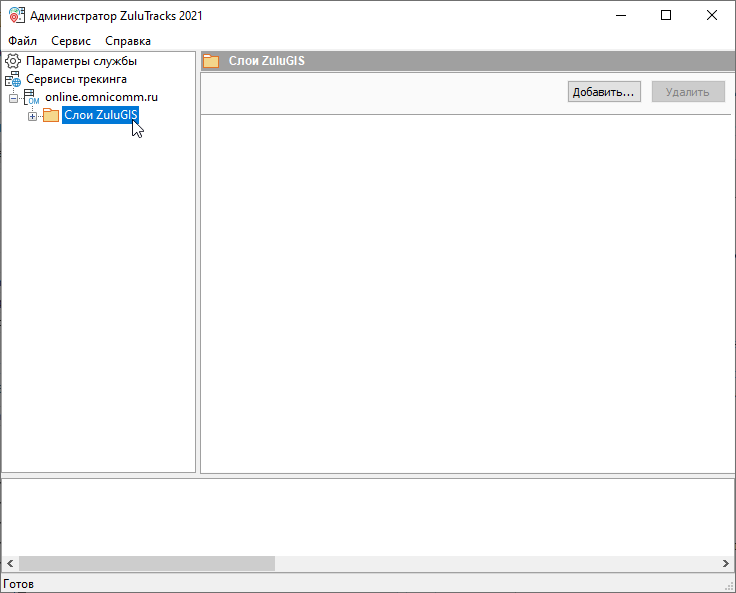 В левой части окна выберите сервис трекинга двойным щелчком (или выделите и нажмите рядом значок +) и выберите пункт Слои ZuluGIS.